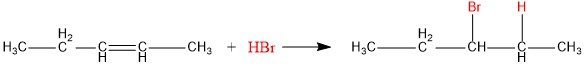 Pada reaksi adisi menggunakan asam halida maka akan berlaku aturan Markovnikov yang berbunyi: