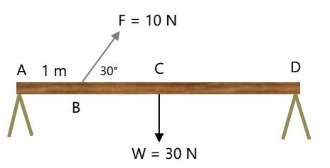Sebuah batang AD homogen 4 m diletakkan di atas penyangga, A dan D dalam keadaan setimbang sesuai diagram di atas. Tentukan gaya ke atas yang dilakukan masing – masing penyangga, jika C merupakan titik berat benda!