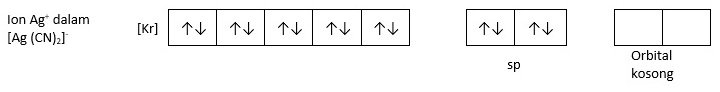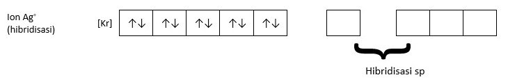 Proses hibridisasi ion kompleks [Ag(CN)2]– dapat dibayangkan terjadi sebagai berikut. Pertama-tama, kita gambar diagram orbital untuk keadaan dasar ion Ag+.