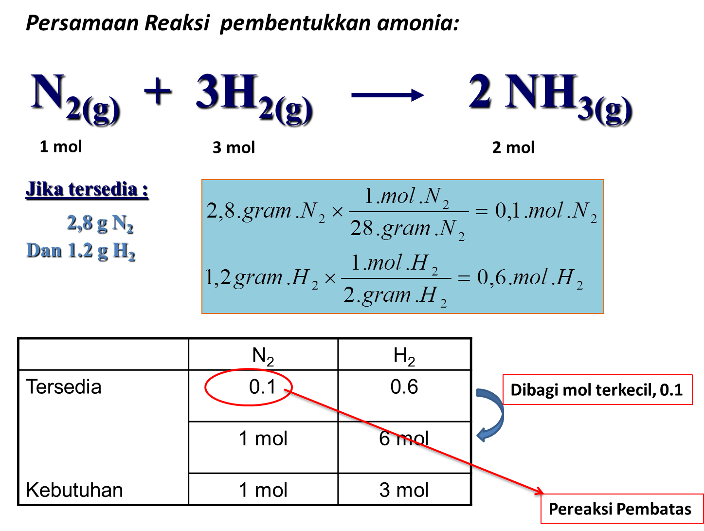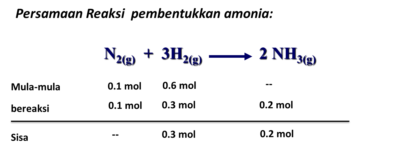 Jadi yang berperan sebagai pereaksi pembatas adalah nitrogen. Gas hidrogen pereaksi berlebih dan amonia yang dihasilkan adalah sebanyak 0,2 mol.