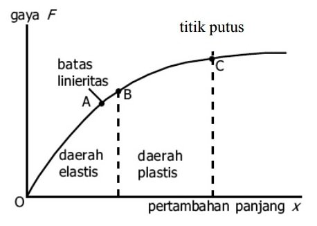 Selanjutnya, jika gaya F diperbesar lagi hingga melewati titik B, maka pegas semakin bertambah panjang dan tidak bisa kembali ke bentuk semula setelah gaya dihilangkan. Jika gaya F ditambah lagi sampai titik C, maka pegas akan putus.