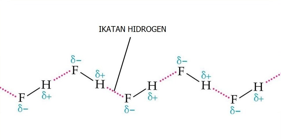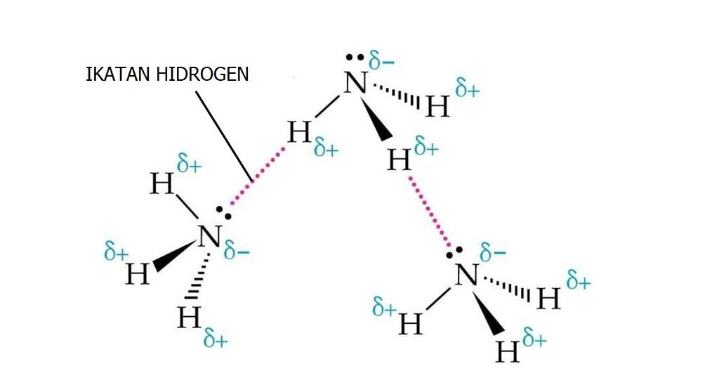 Ikatan Hidrogen terjadi ketika atom H dari 1 molekul tertarik ke atom yang sangat elektronegatif. Atom-atom yang sangat elektronegatif yaitu Nitorgen (N), Oksigen (O), dan Fluor (F). Ikatan hidrogen terjadi pada setiap senyawa yang mempunyai ikatan N-H, O-H, dan F-H contohnya pada molekul NH3, H2O, dan HF.