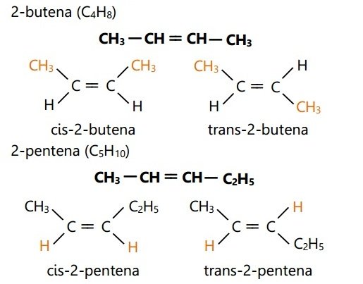 - Bentuk cis- terjadi ketika gugus yang sama berada pada satu sisi.