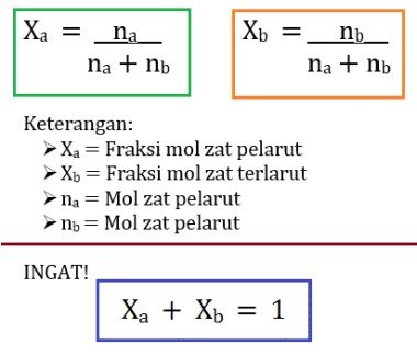 Fraksi mol menyatakan perbandingan jumlah mol zat terlarut dan mol zat pelarut terhadap jumlah mol larutan. Fraksi mol (X) dirumuskan sebagai berikut.