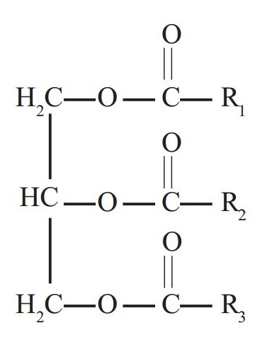 Pada lemak, satu molekul gliserol mengikat tiga molekul asam lemak, oleh karena itu lemak adalah suatu trigliserida. Rumus struktur umum molekul lemak adalah sebagai berikut.