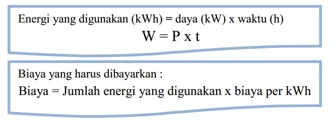 Perhitungan pemakaian energi listrik di rumah dapat dilakukan dengan menggunakan persamaan berikut.