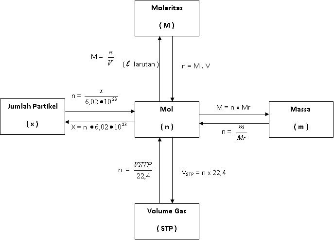 Konsep mol dan hubungannya dengan jumlah partikel, massa molar, volume molar, dan molaritas dapat kita gambarkan sebagai berikut.