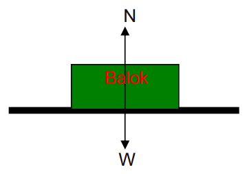 Sebuah balok diletakkan di atas lantai. Balok memberikan gaya pada lantai sebesar gaya beratnya W. Jika balok tidak melesak ke dalam lantai karena lantai memberikan gaya reaksi yang sama besar dengan berat W. Gaya reaksi ini sering disebut gaya normal (N) yang arahnya tegak lurus permukaan lantai.