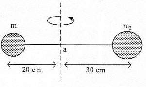 Dua bola masing – masing massanya m1 = 2kg dan m2 3 kg dihubungkan dengan batang ringan tak bermassa seperti pada gambar.