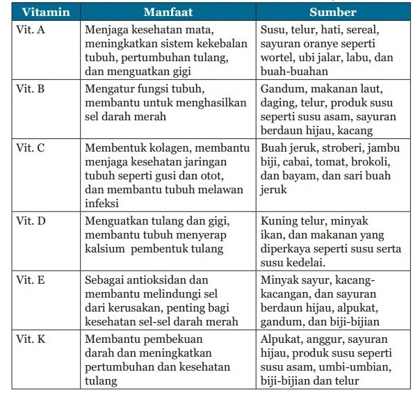 Vitamin adalah molekul organik kompleks yang berfungsi mengaktifkan kerja enzim dan membantu fungsi enzim. Semua jens vitamin dibagi menjadi dua golongan besar yaiitu vitamin yang larut dalam air (vitamin B dan C) dan vitamin yang larut dalam lemak (Vitamin A, D, E, dan K). Perhatikan tabel vitamin berikut ini.