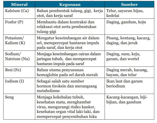 Mineral merupakan nutrisi yang sedikit mengandung atom karbon. Fungsi utama meneral adalah membantu proses pembangunan sel, membantu reaksi kimia tubuh, mengangkut oksigen keseluruh tubuh, dan membentuk serta memilihara tulang. Berbagai mineral yang dibutuhkan tubuh serta kegunaan dan sumbernya telah kami sajikan pada tabel mineral berikut ini.