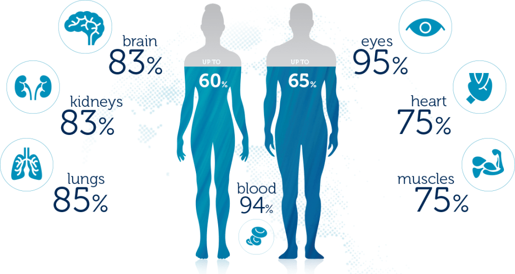 Air dibutuhkan oleh tubuh sebagai pembentuk sel dan cairan tubuh, pengaturan suhu tubuh, pelarutan zat-zat gizi lain dan pembatu proses pencernaan makanan, pelumas dan bantalan, media transportasi, dan media pengeluaran sisa metabolisme.