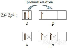 Sehingga dapat kita ketahui bahwa elektron valensi B adalah 2s2 2p1 yang dapat kita gambarkan sebagai berikut: