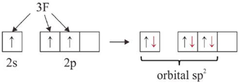 Dalam molekul BF3 satu atom B berikatan dengan 3 atom F. Proses ikatan berlangsung dengan eksitasi 1 elektron B dari orbital 2s ke orbital 2p. Kemudian 3 elektron atom F masuk ke dalam orbital 2s dan 2p yang menyebabkan terbentuknya orbital hibrida sp2. Jika digambarkan prosesnya sebagai berikut: