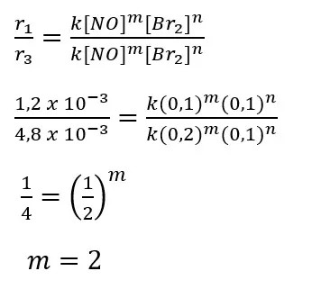 Untuk menentukan orde reaksi terhadap NO kita gunakan data percobaan 1 dan 3 dengan langkah perhitungan sebagai berikut.