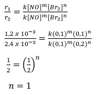 Kita gunakan percobaan 1 dan 2 untuk menentukan orde reaksi terhadap gas Br2.