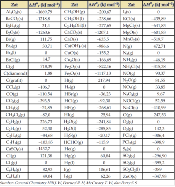 Tabel Data Perubahan Entalpi Pembentukan Standar