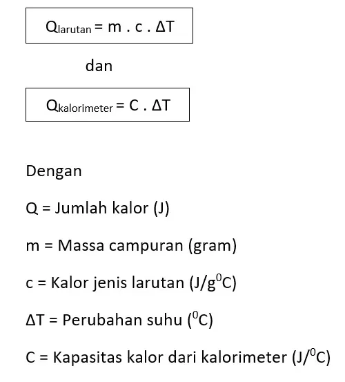 Dengan mengukur kenaikan suhu di dalam kalorimeter, kita dapat menentukan jumlah kalor yang diserap oleh air serta perangkat kalorimeter berdasarkan rumus: