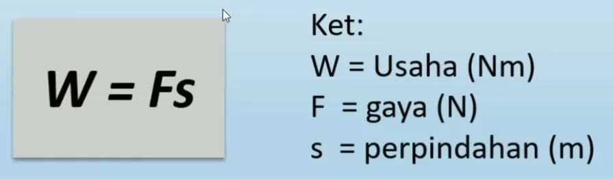 Usaha, dalam konteks fisika, adalah gaya yang diterapkan pada suatu objek untuk memindahkannya melawan suatu rintangan atau hambatan. Untuk melakukan usaha, objek harus bergerak dalam arah gaya yang diterapkan. Dalam sistem fisika tertentu, usaha (W) dapat dihitung sebagai perkalian antara gaya (F) yang diterapkan pada suatu objek dan perpindahan (s) objek tersebut sepanjang arah gaya tersebut.