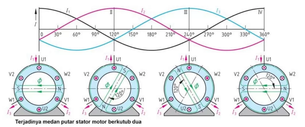 Terbentuknya medan putar pada stator motor induksi. Tampak stator dengan dua kutub.