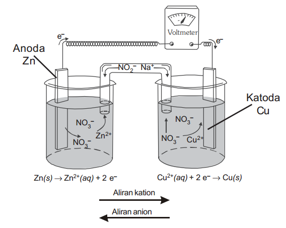 Dapat kita lihat pada gambar sel galvani tersebut, gelas kimia sebelah kiri telah diisi dengan larutan ZnSO4 dan dicelupkan logam Cu sebagai elektroda. Kemudian elektroda Cu dihubungkan dengan kutub positif voltmeter dan elektroda Zn dihubungkan dengan kutub negatif voltmeter.