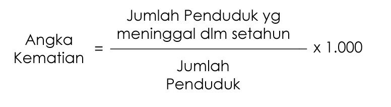 Kematian adalah faktor utama yang dapat menyebabkan penurunan jumlah penduduk di suatu wilayah. Angka kematian suatu wilayah dapat ditentukan dengan menggunakan rumus sebagai berikut: