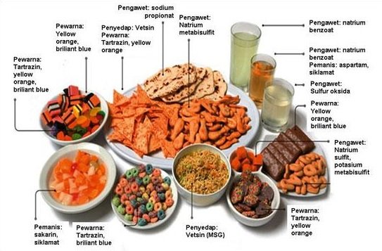 | 3 | Pengawet | Garam, cuka, kayu manis, mengeringkan, memanaskan, penyinaran, pengalengan | Asam benzoate, kalsium benzoate, asam propinat, asam sorbat, kalsium sorbat, natrium metabisufit, butil hidroksianisol (BHA), butil hidroksitoluen (BHT), natrium nitrat (NaNO3), asam askorbat |