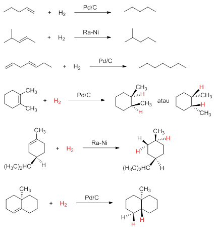 Hidrogenasi alkena adalah reaksi pemutusan ikatan rangkap oleh hidrogen molekuler (H2) yang melibatkan katalis nikel, platina, atau paladium. Contohnya pada reaksi-reaksi berikut ini.
