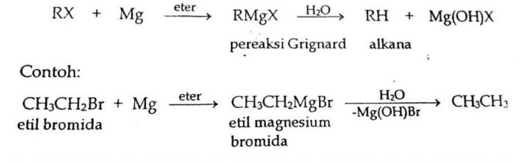 Reduksi alkil halida dapat berlangsung melalui reaksi Grignard atau reduksi dengan logam dan asam secara langsung. Dalam reaksi ini terjadi pertukaran yang sederhana antara atom halogen dan atom hidrogen, sedangkan rantai karbon tidak berubah.