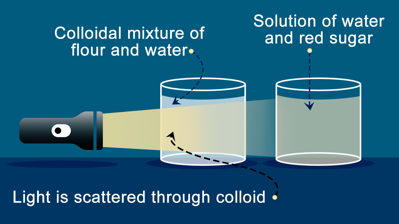 Pada saat larutan sejati disinari dengan cahaya, maka larutan tersebut tidak akan menghamburkan cahaya, sedangkan pada sistem koloid, cahaya akan dihamburkan. hal itu terjadi karena partikel-partikel koloid mempunyai partikel-partikel yang relatif besar untuk dapat menghamburkan sinar tersebut. Sebaliknya, pada larutan sejati, partikel-partikelnya relatif kecil sehingga hamburan yang terjadi hanya sedikit dan sangat sulit diamati.