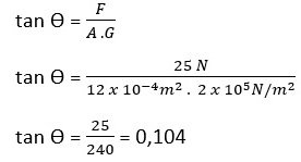 Seorang pelari maraton bersiap untuk lari dengan menapakkan kakinya pada pijakan yang berketebalan 8 cm dan luas 12 cm2. Jika kaki pelari menekan dengan gaya 25 N pada pijakan dan modulus geser pijakan 2,5 x 105 N/m2, nilai tangen dari sudut gesernya adalah …