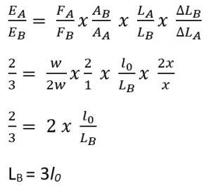 Kawat jenis A dan B memiliki penampang lintang dengan rasio diameter 1 : 2 dan rasio modulus Young 2 : 3. Jika kawat A dengan lanjang l0 diberi beban sebesar w teregang sejauh x dan jika kawat B diberi beban 2w teregang sejauh 2x maka panjang kawat B adalah …