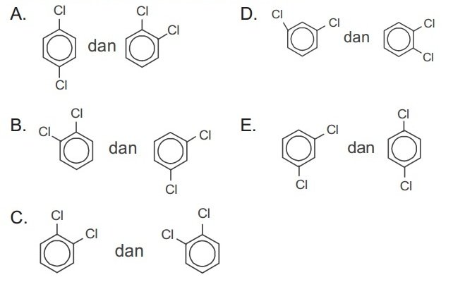 Pasangan struktur benzena yang setara dari hasil substitusi benzena berikut adalah ….