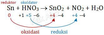 Jadi, bilangan oksidasi dari zat oksidator dan hasil reduksinya berturut-turut adalah +5, NO2. Jawaban D.