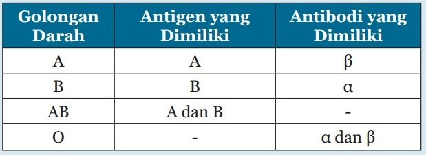 Golongan darah seseorang ditentukan berdasarkan ada atau tidaknya zat antigen pada sel darah merah dan plasma darah. Ada dua jenis antigen pada sel darah merah, yaitu antigen-A dan antigen-B. Antibodi dalam plasma darah juga terdiri atas dua jenis, yaitu antibodi anti-A dan antibodi anti-B.