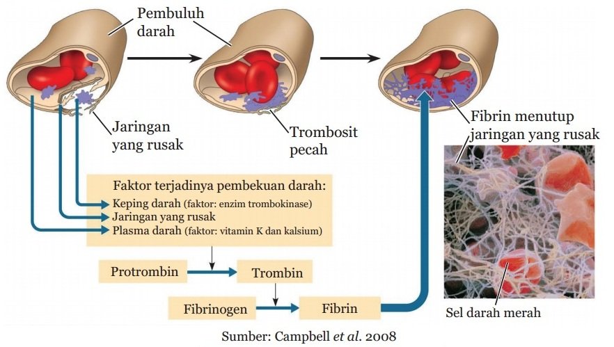 Jika suatu jaringan tubuh terluka maka trombosit pada permukaan yang luka akan pecah dan mengeluarkan enzim trombinasi (tromboplastin). Enzim ini akan mengubah protrombin menjadi trombin dengan bantuan ion kalsium dan vitamin K. Slanjutnya, trombin mengubah fibrinogen (larut dalam plasma darah) menjadi fibrin (tidak larut dalam plasma darah) yang berbentuk benang-benang halu. Benang-benang halus ini menjerat sel-sel darah merah membentuk gumpalan sehingga darah membeku.