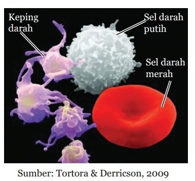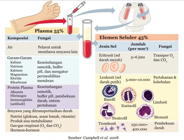 Komponen penyusun darah, terdiri atas plasma darah, sel darah merah (eritrosit), sel darah putih (leukosit), dan keping darah (trombosit). Komposisi plasma darah sekitar 55%, sedangkan sel-sel darah dan keping darah (elemen seluler) sekitar 45%.